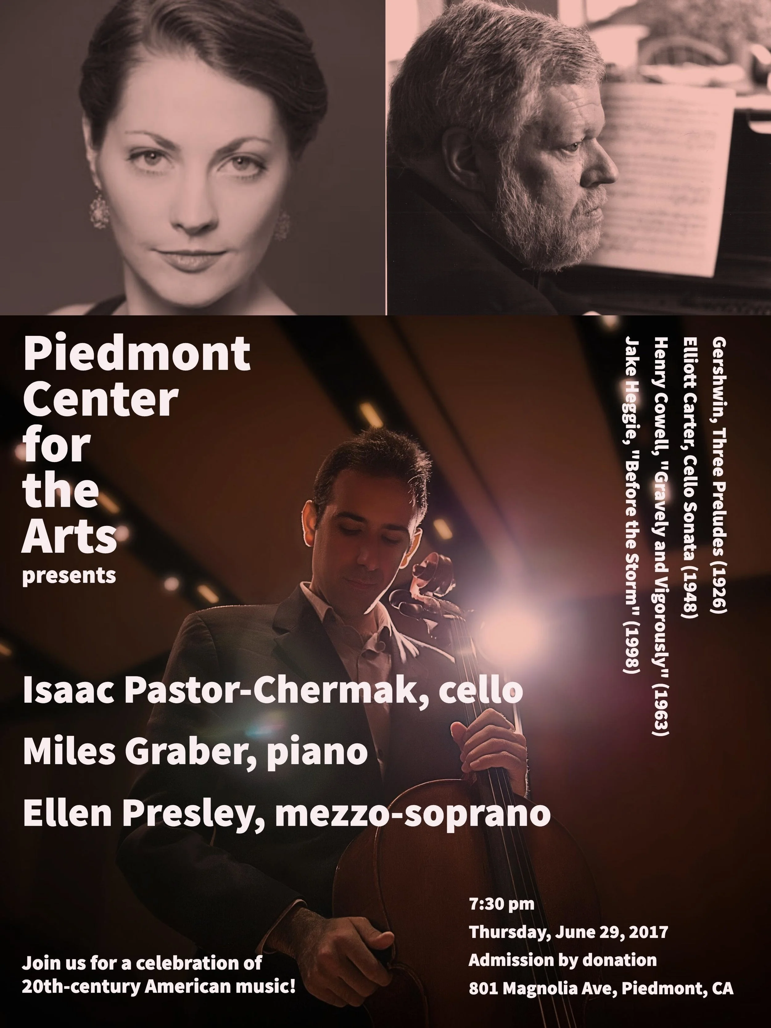 Henry Cowell, "Gravely and Vigorously" for solo cello: A short and elegiac composition for the cello alone, written in memory of President John F. Kennedy the day after his assassination in 1963. This is a rarely-performed and highly affecting piece that Isaac pleased to be reintroducing to audiences.