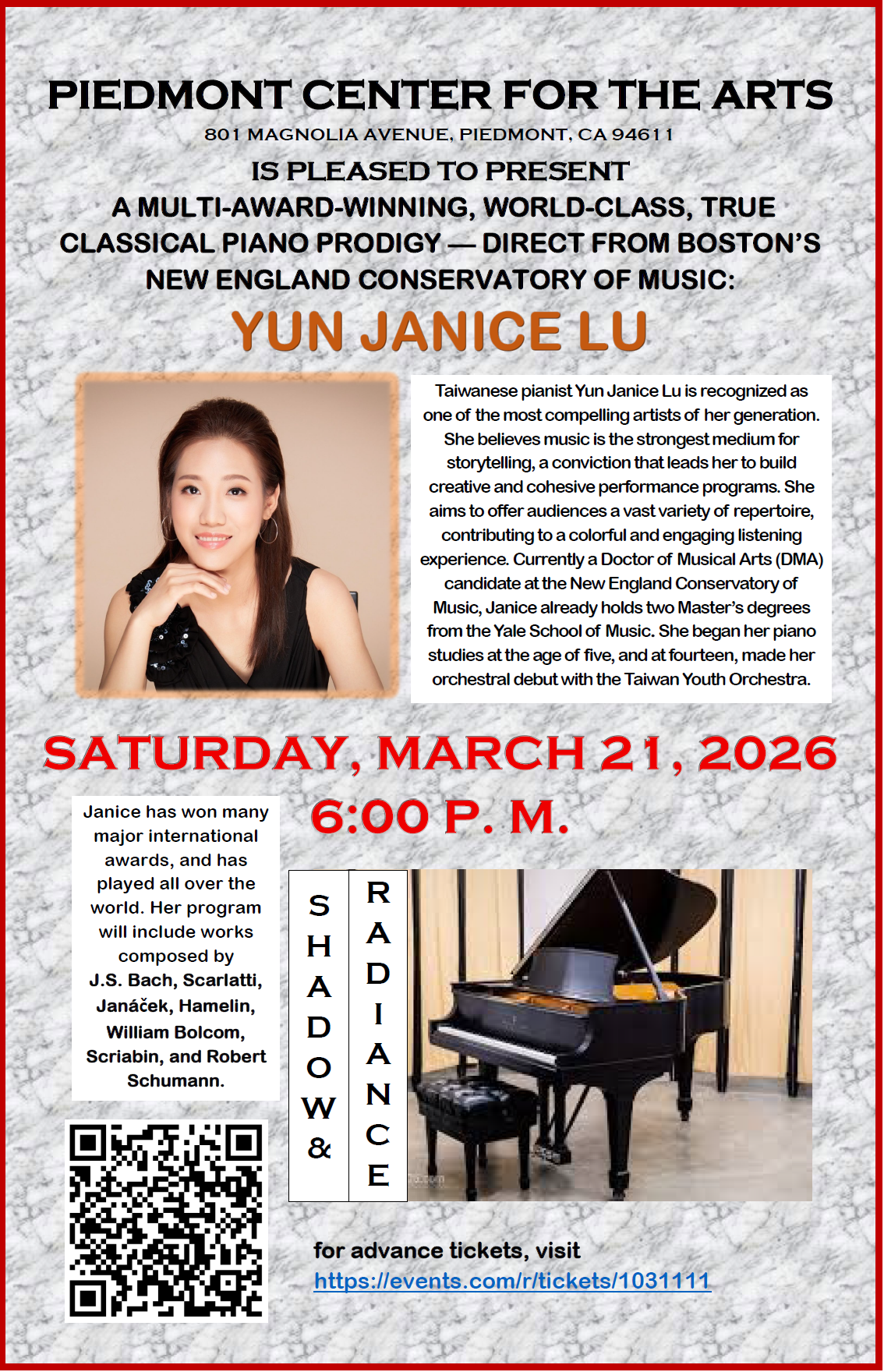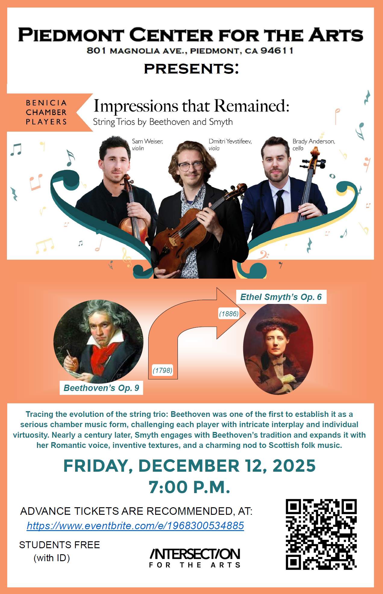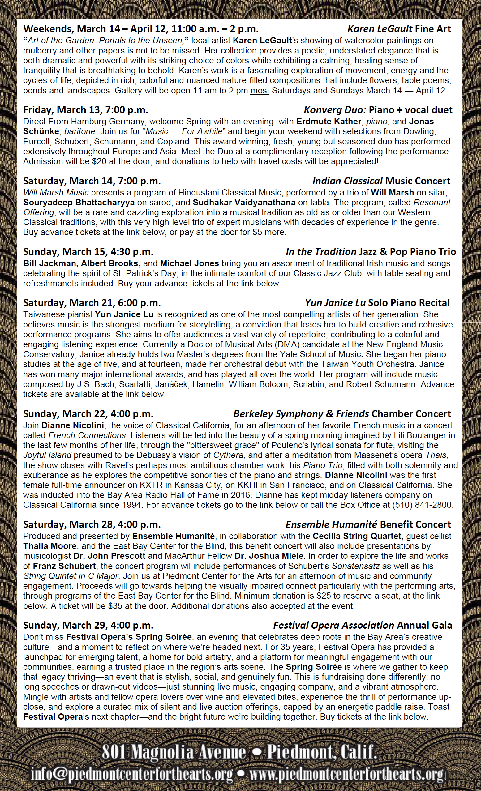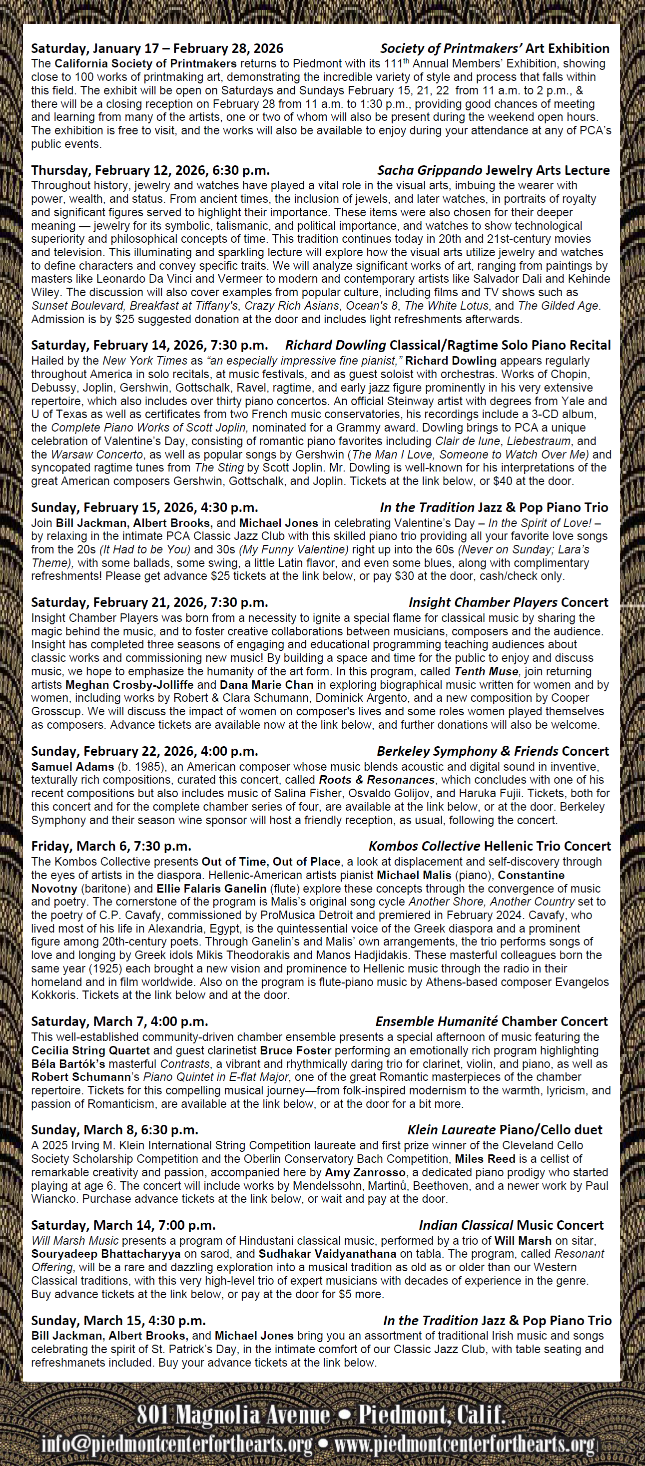 The mission of Piedmont Center for the Arts is to enable artists and students in various artistic disciplines – including music, dramatic arts, visual arts, and literature – to perform and display their works for residents of Piedmont and surrounding communities. Please see “WHO WE ARE” for more details and some of our primary goals.